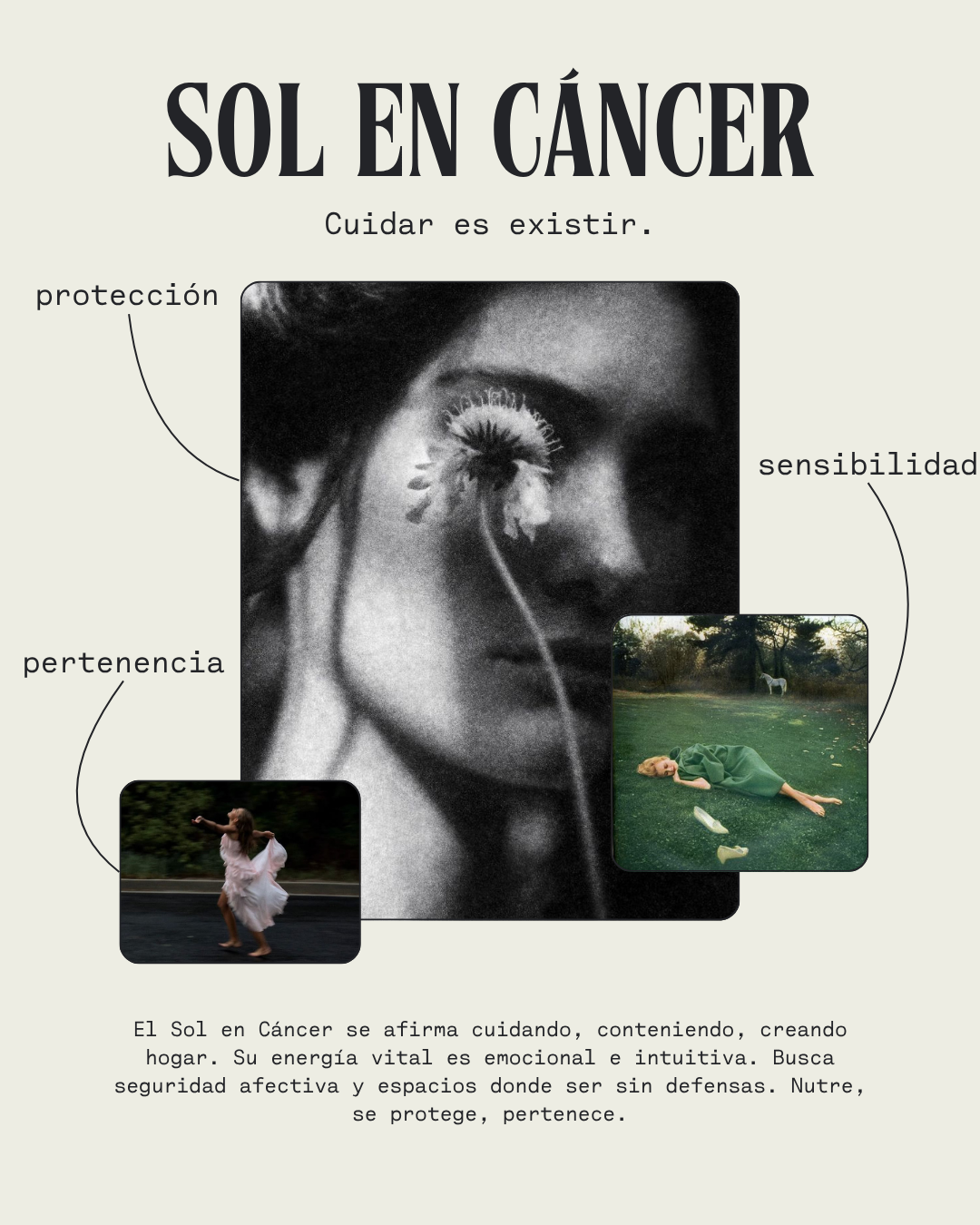 Cáncer es el signo del origen, la raíz emocional y el deseo de proteger. Representa la sensibilidad profunda y la fuerza que hay en el cuidado.