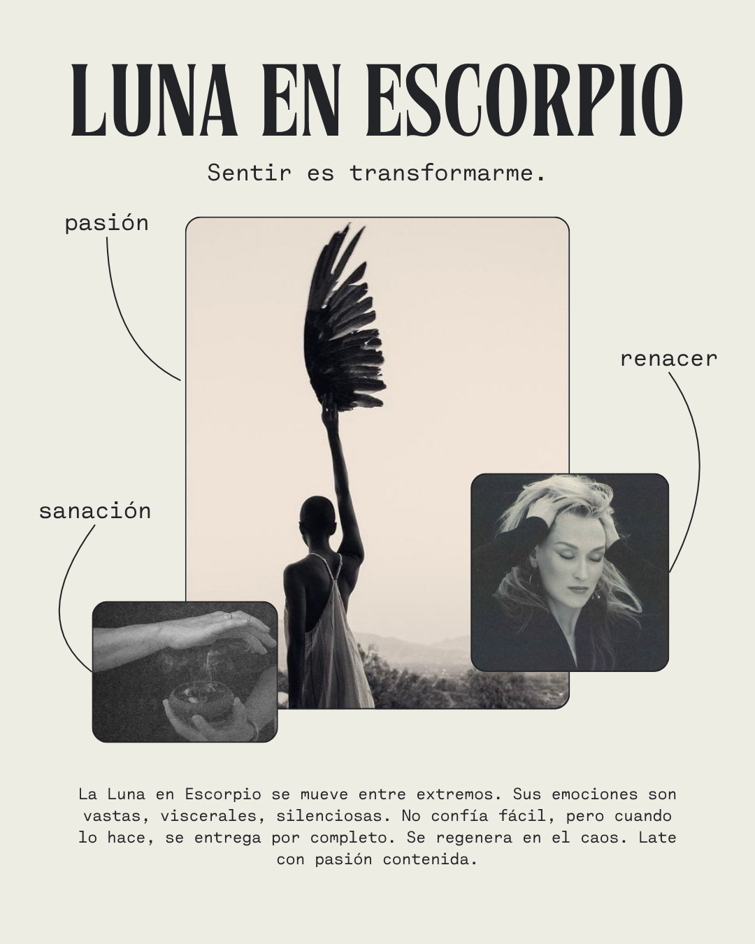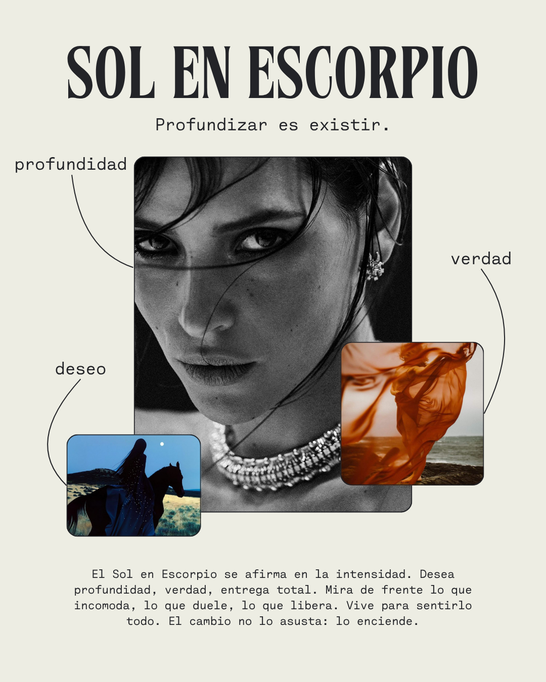 Escorpio es agua profunda, emocional e intensa. Representa la búsqueda de lo real, el deseo de transformación y el arte de renacer desde lo oscuro.