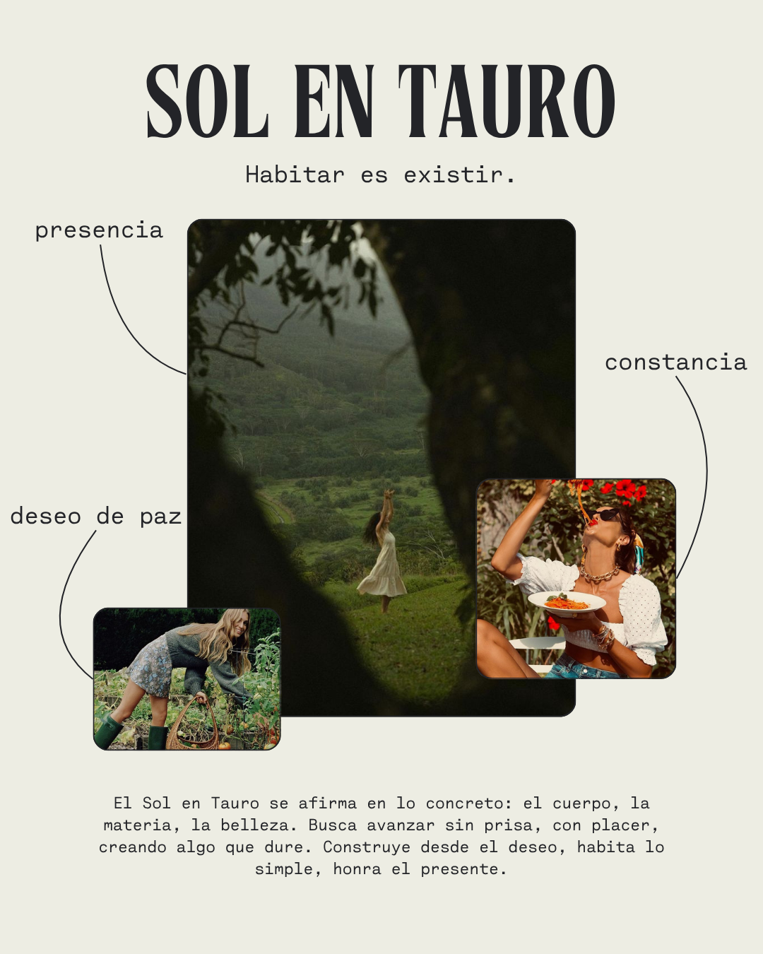 Tauro es tierra firme. Representa el deseo de paz, permanencia y conexión con los sentidos.