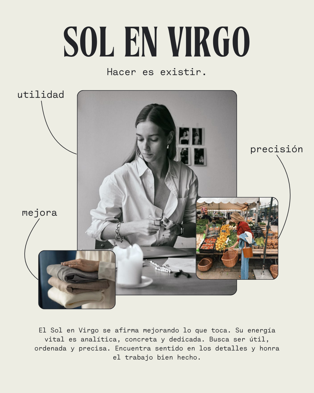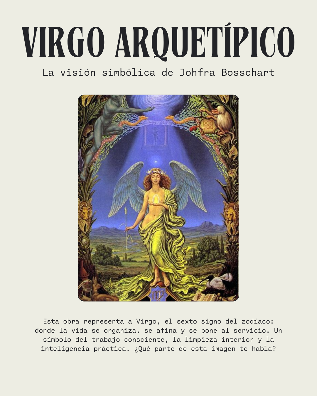 Virgo es tierra que se afina. Representa la necesidad de entender, servir y mejorar lo que toca.
