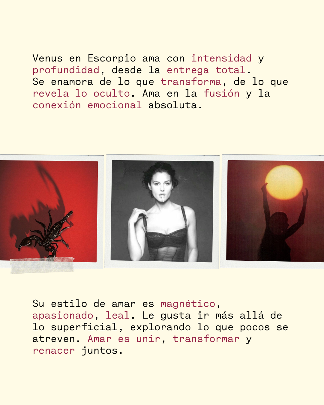 Venus en Escorpio ama con pasión transformadora. Se enciende con la conexión total, la lealtad absoluta y lo que revela el alma.