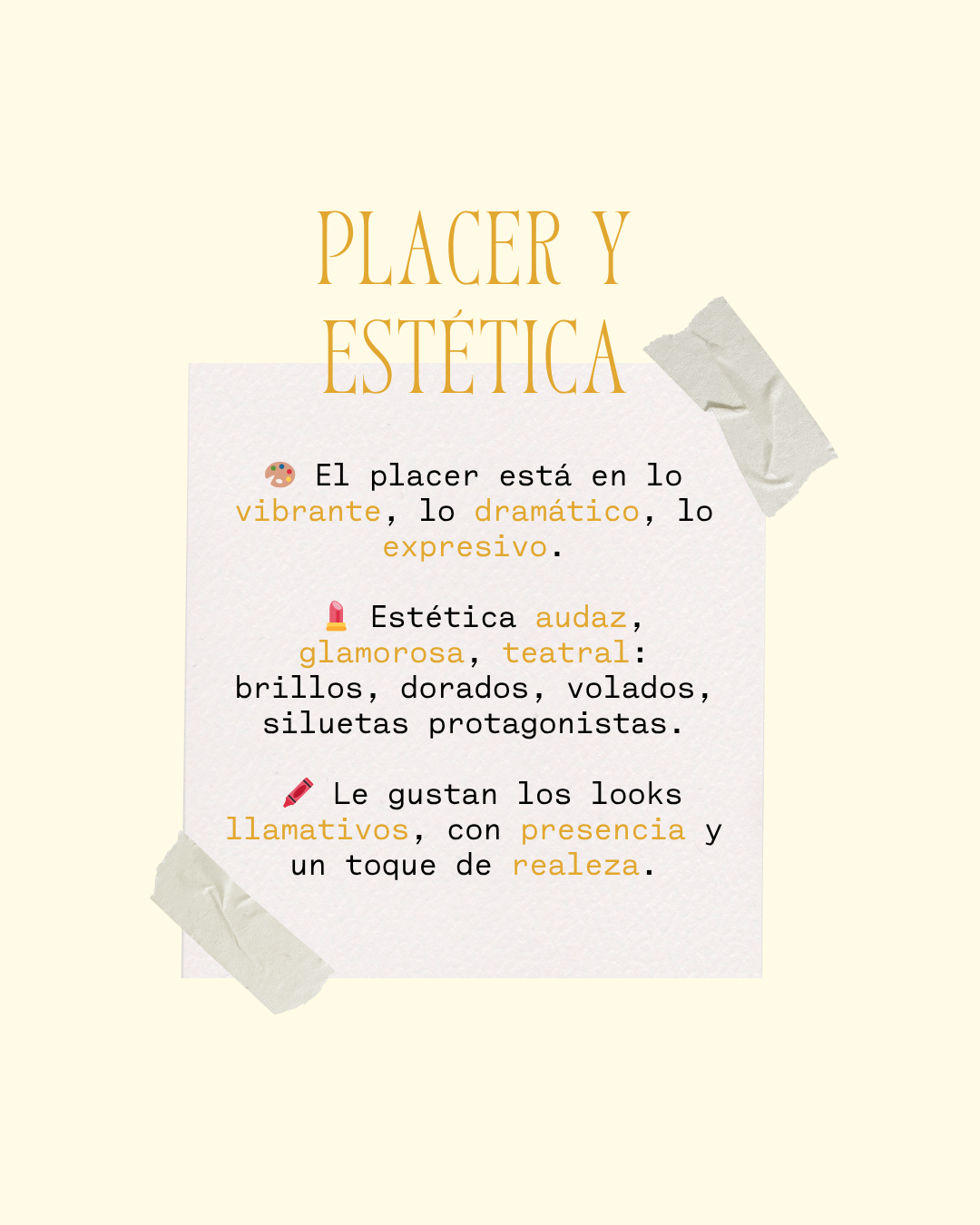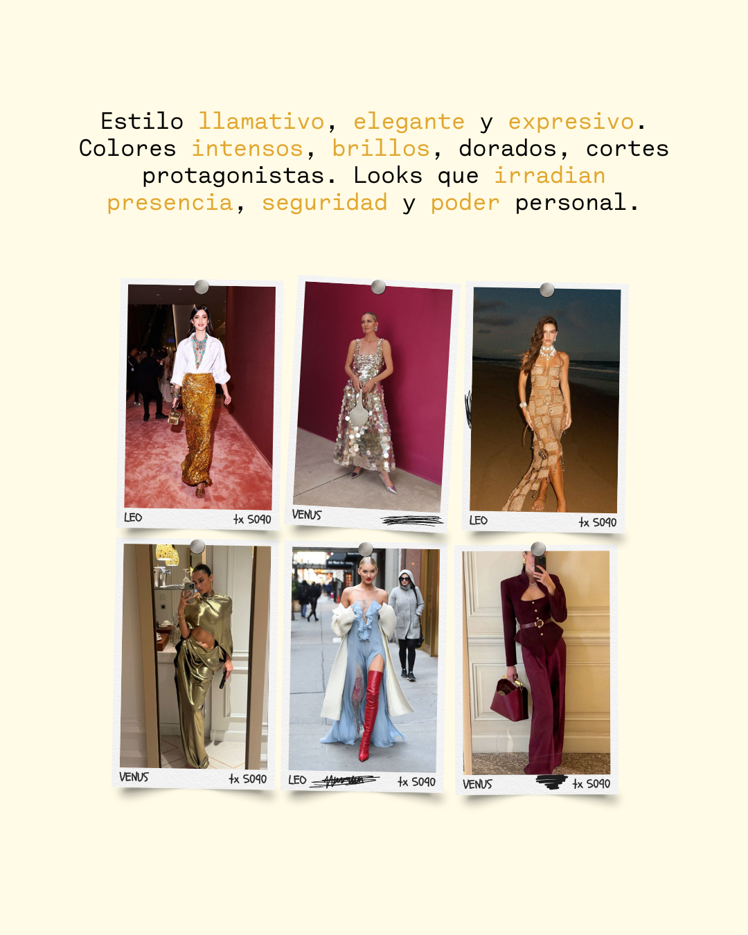 Estilo llamativo, glamoroso, con poder y juego. Siempre reina, nunca pasa desapercibida.