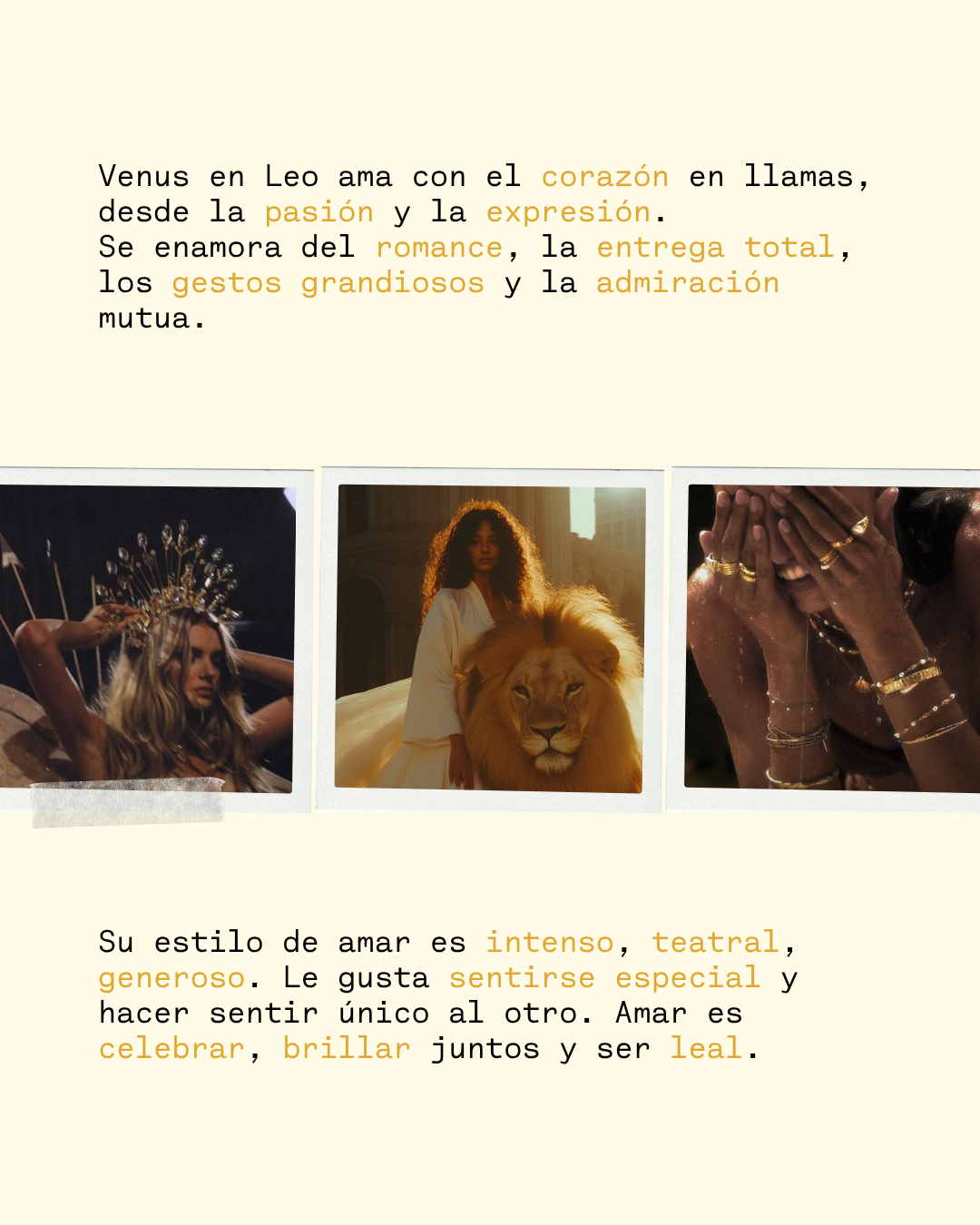 Venus en Leo ama con pasión y grandeza. Se enciende con la admiración, la presencia y los gestos teatrales.