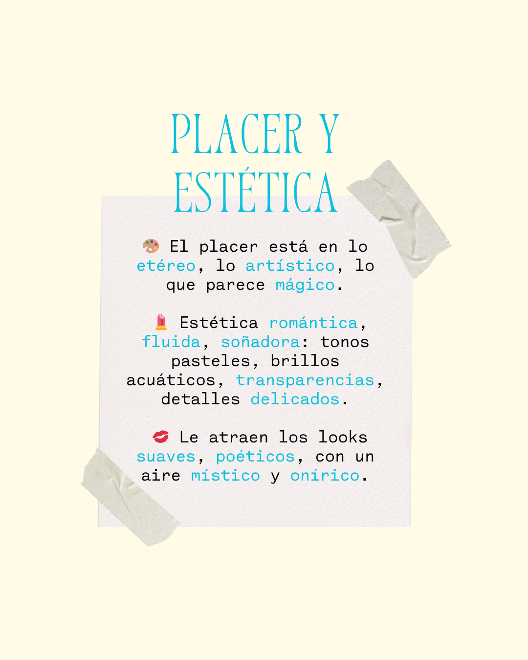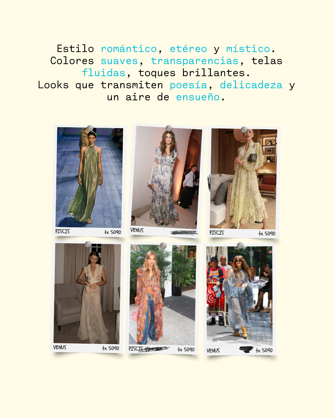 Estilo etéreo, romántico, onírico. Telas fluidas, brillos acuáticos, tonos pasteles, transparencias. Todo vibra como un sueño.