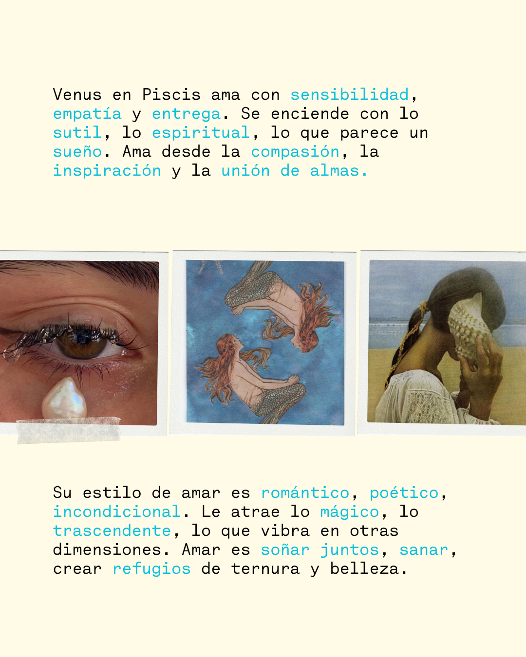Venus en Piscis ama con ternura y entrega. Se enciende con lo espiritual, lo poético y lo que parece un sueño.